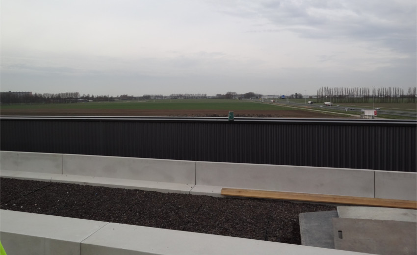 Deze foto is genomen vanaf het parkeerdek. Er is te zien dat rechts een snelweg loopt. Links zijn er plannen om in de toekomst een woonwijk te realiseren. Op dit moment is deze grond eigendom van Lely zelf, waarop ze hun landbouwvoertuigen testen.